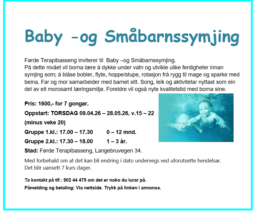 Førde Terapibasseng starter ny runde med «babysymjing», Torsdag 09.04.26 – 28.05.26 (-v.20)